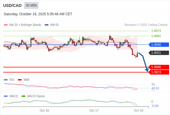 技术点评: RSI技术指标小于中性区域50。 MACD技术指标处在其信号线之下看空。 配置为负。 此外,价位低于其20天及50天移动平均线 ( 分别位于1.4033 和1.4041 )。