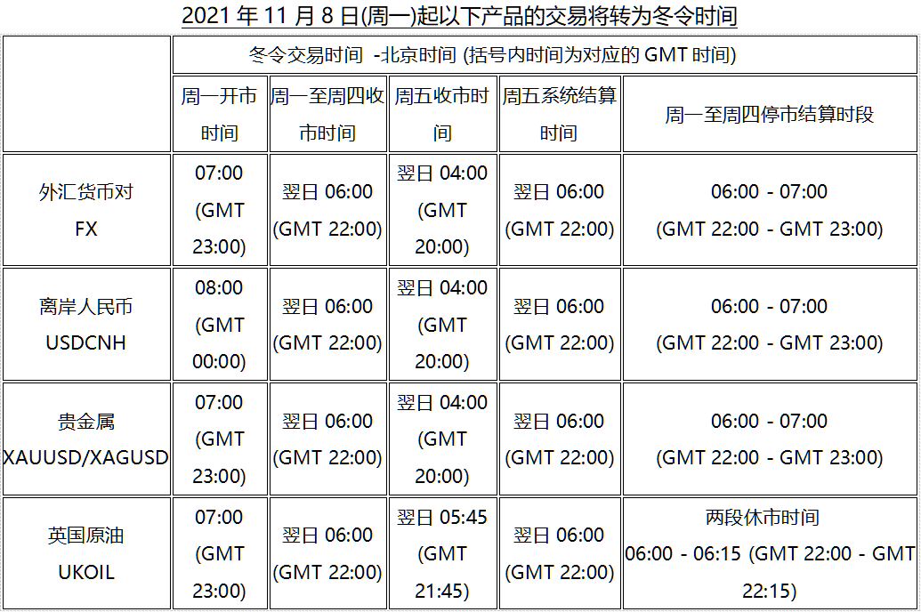 因应欧洲时区于2021年11月1日(周一)及美国时区于2021年11月8日(周一)开始分别转为冬令时间, 本公司各产品交易时间将调整为冬令时间,敬请留意。